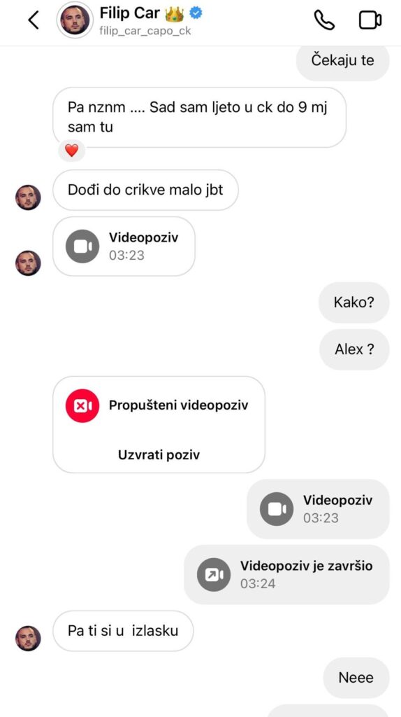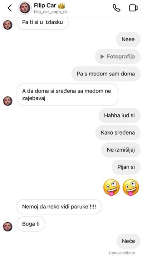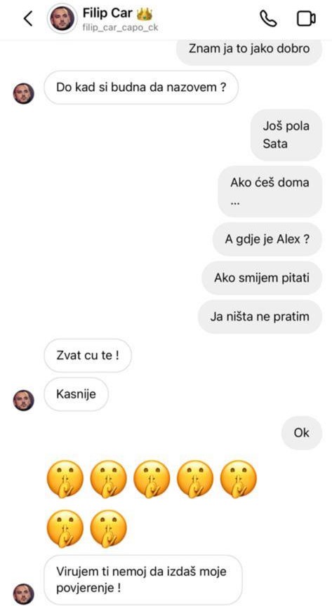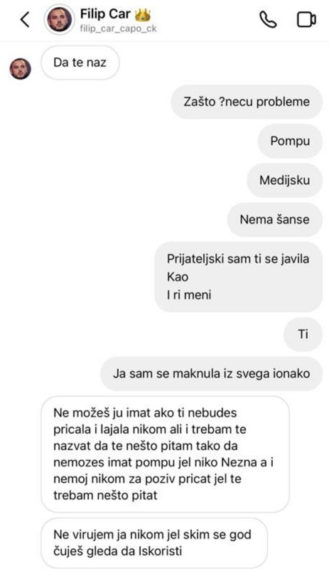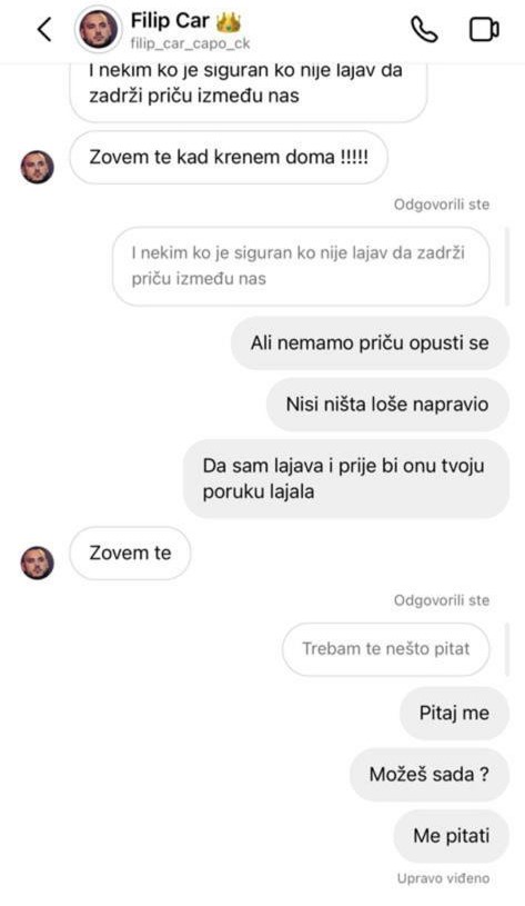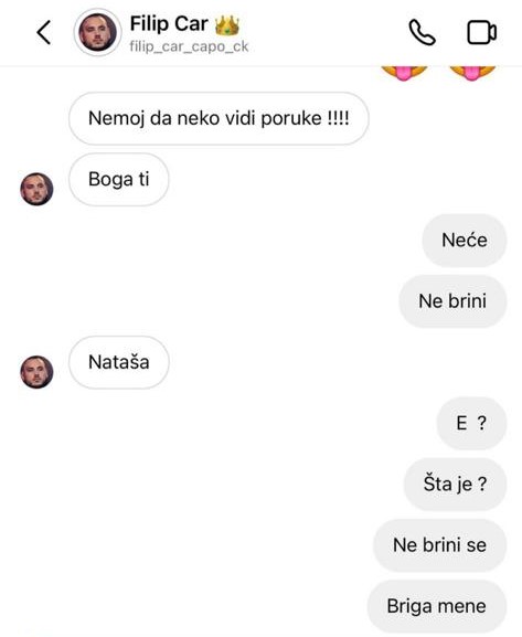 Na adresu naše redakcije stigla je prepiska između Filipa Cara i bivše rijaliti učesnice Nataše Moskve.