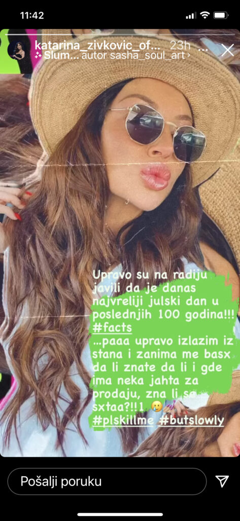 Katarina Živković oglasila se na svom Instagram profilu povodom izjave pevačice Didi J ,,Kome je vruće neka sebi kupi jahtu“, koja je izazvala mnogobrojne komentare.