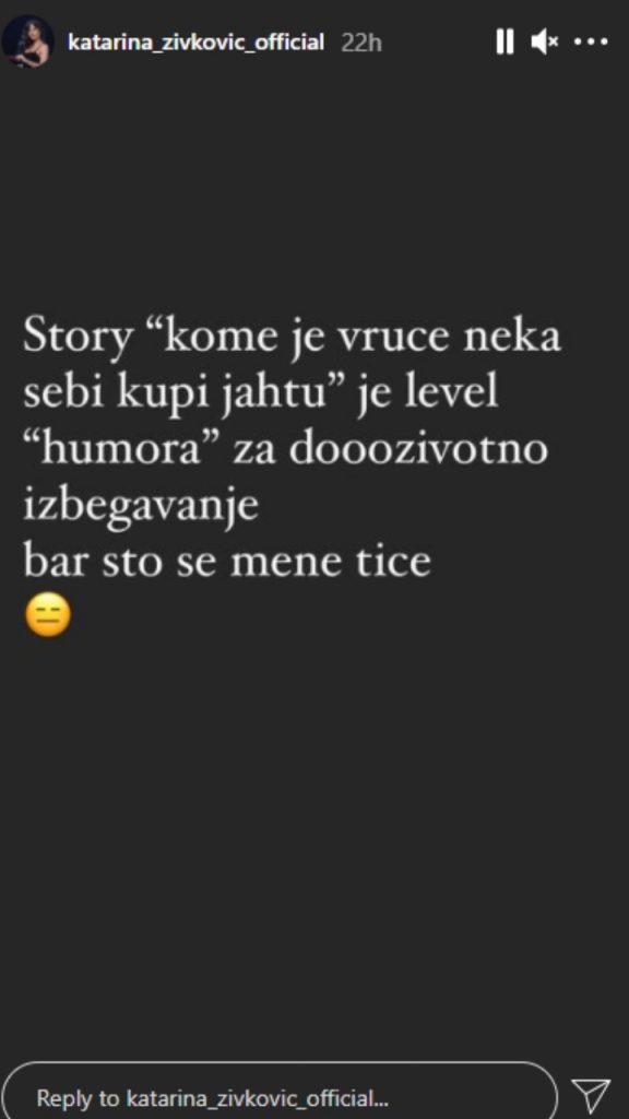 – Story ,,kome je vruće neka sebi kupi jahtu“ je level ,,humora“ za doživotno izbegavanje bar što se mene tiče – poručila je Kaća.