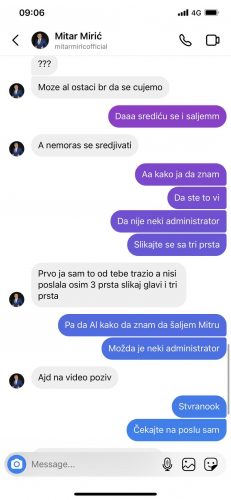 – A kako ja da znam da ste to vi da nije neki administrator. Slikajte se sa tri prsta – uzvratila je ona istom merom, ali to je pevaču zasmetalo.