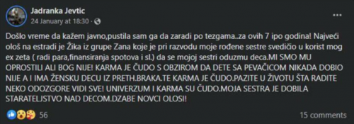 – Došlo je vreme da kažem javno. Pustila sam ga da zaradi po tezgama. Najveći ološ na estradi je Žika iz grupe “Zana” koji je pri razvodu moje rođene sestre svedočio u korist mog bivšeg zeta (radi para, finansiranja, spotova..) da se mojoj sestri oduzmu deca. Mi smo mu oprostili, ali bog nije. Karma je čudo s obzirom na to da dete pevačicom nikada dobio nije, a i ima žensku decu iz prethodnih brakova. Pazite u životu šta radite neko odozgo vidi sve.Univerzum i karma su čudo – napisala je Jadranka.