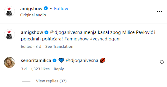 Naime, Milica je označila Vesnu Đogani i ostavila joj emotikon poljupca, a mnogi su bili oduševljeni ovim potezom Pavlovićeve: „Bravo carice, tako se to radi“, „ljubomorne duše“, „ti si kraljica i tu nema dalje“…