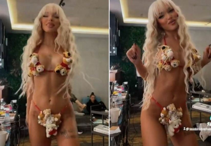 Pevačica je u spotu u brusu i tangama na koje su nakačeni plišani medvedići. Svaki detalj na njenom golišavom telu je došao do izražaja u TikTok videu koji je Teodora snimila tokom rada na spotu, a korisnicima se nije dopalo ni što je koristila dečije igračke da bi izgledala „bezobrazno“.