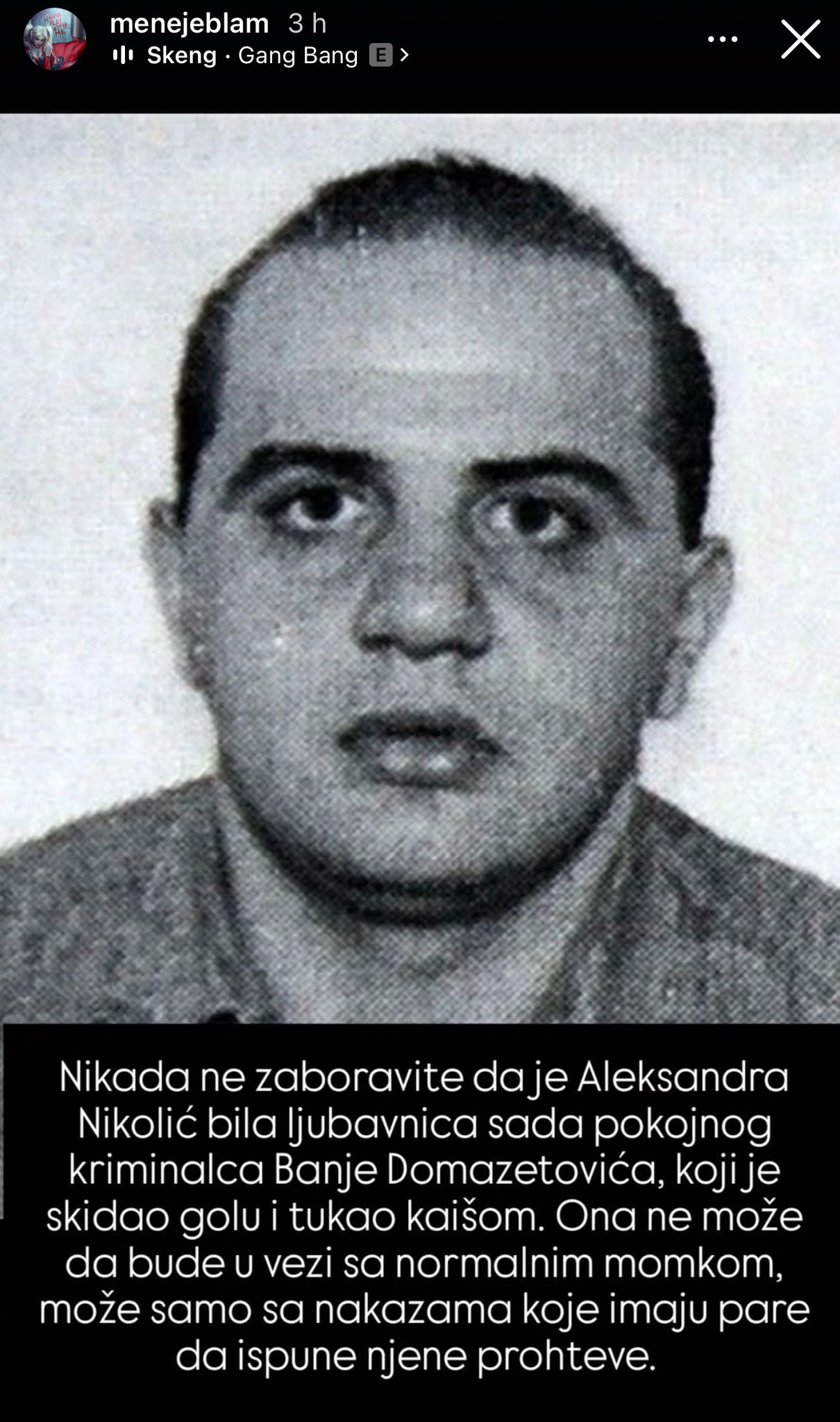 „Nikada ne zaboravite da je Aleksandra Nikolić bila ljubavnica sada okojnog kriminalca Banje Domazetović. Koji je skidao golu i tukao kaišem. Ona ne može da bude u vezi sa normalnim momkom. Može samo sa nakazama koje imaju pare da ispune njene prohteve“., pisalo je u objavi.