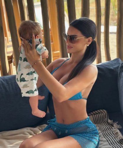 Tamara je pozirala sa naslednikom dok je na sebi imala bikini, grudi su bile u prvom planu, ali i ravan i zategnut stomak, pa mnogi kažu da izgleda kao da se nije ni porađala.