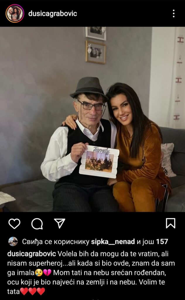 Dušičin opis ispod fotografije: „volela bih da mogu da te vratim, ali nisam superheroj…ali kada si bio ovde, znam da sam te imala. Mom tati na nebu srećan rođendan, ocu koji je bio najveći na zemlji i na nebu. Volim te tata!“ -napisala je neutešna Grabovićeva.