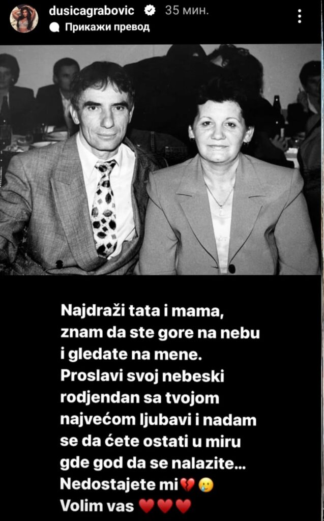 Na društvenoj platformi Instagram Dušica je podelila svoju tugu sa slikom pokojnih roditelja baš na dan rođenja svog pokojnog oca.