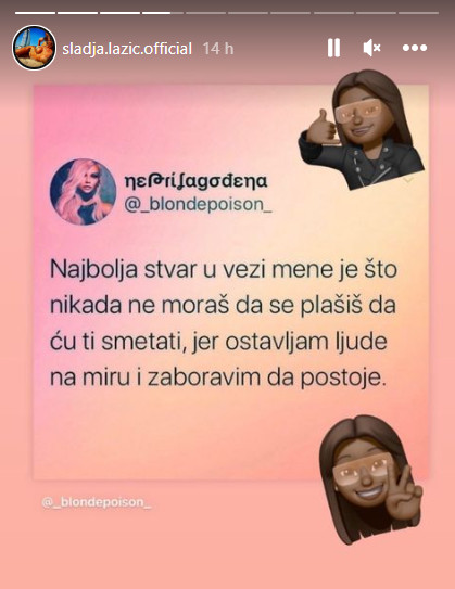 Sada se Slađa oglasila putem svog Instagram storija i jasno stavila do znanja kakvo je stanje među njima. Objava očigledno nosi određenu poruku upućenu, kao i da Slađa više nema tolerancije za njega.