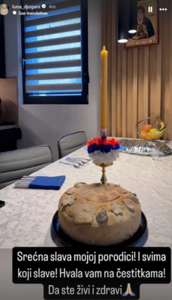 Luna je sa svojim pratiocima na Instagramu podelila trenutke priprema, pa ponosno pokazala slavski kolač ukrašen hrišćanskim simbolima, slavsku sveću, kao i bogato pripremljenu trpezu. Dok je u pozadini stajala ikona i dekorativni detalji koji su upotpunili prazničnu atmosferu.