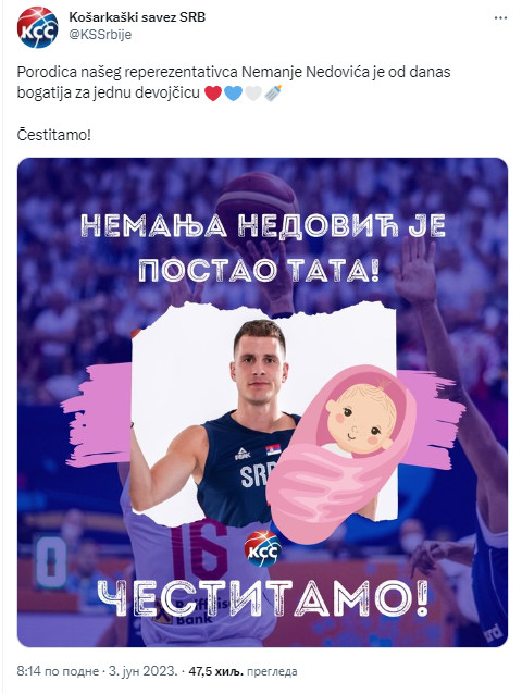 Velika radost je ispunila dom košarkaša Crvene zvezde i reprezentativca Srbije, Nemanje Nedovića, i njegove supruge Mine Milutinović. U subotu, Mina je donela na svet predivnu devojčicu.