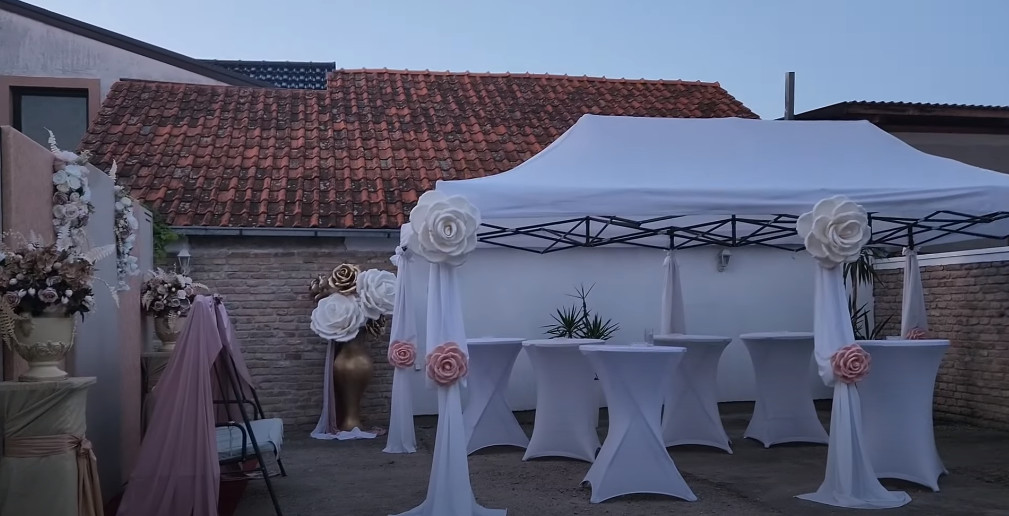 Porodična kuća u Veterniku je ukrašena sa puno ljubavi i pažnje za ovu svadbu. Ruže u belim, roze i zlatnim nijansama, cveće, roze baldahin posebno za mladence, baloni – sve je bilo predivno. Beli stolnjaci prekrivali su barske stolove pod belim šatorom, a mesto za di-džeja i muzičare je pažljivo organizovano.