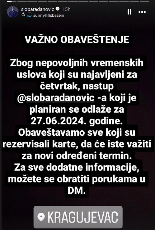 – Zbog nepovoljnih vremenskih uslova koji su najavljeni za četvrtak, nastup koji je planiran se pomera za 27 jun. Obaveštavamo sve koji su rezervisali karte, da će iste važiti za novi određeni termin. Za sve dodatne informacije možete se obratiti direktno u inboks – stoji u objavi folk pevača.