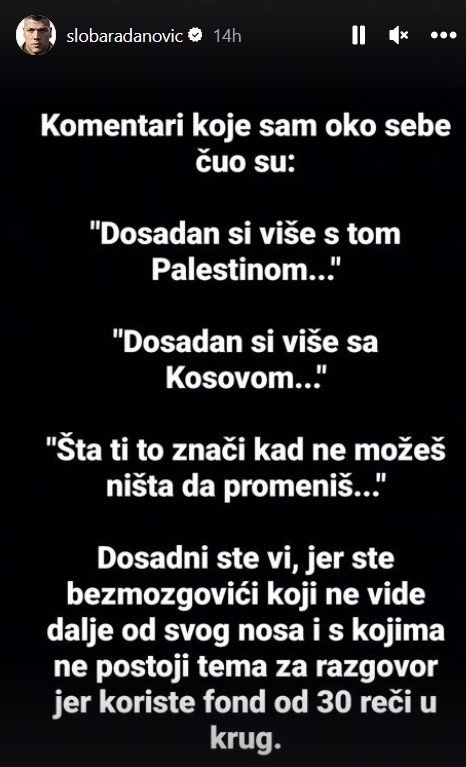 „Dosadan si više sa tom Palestinom“, „Dosadan si više sa Kosovom“, „Šta ti to znači kad ne možeš ništa da promeniš…“, neki su od komentara koje je pevač okačio na svom instagram profilu, ali im je on odgovorio u svom stilu: