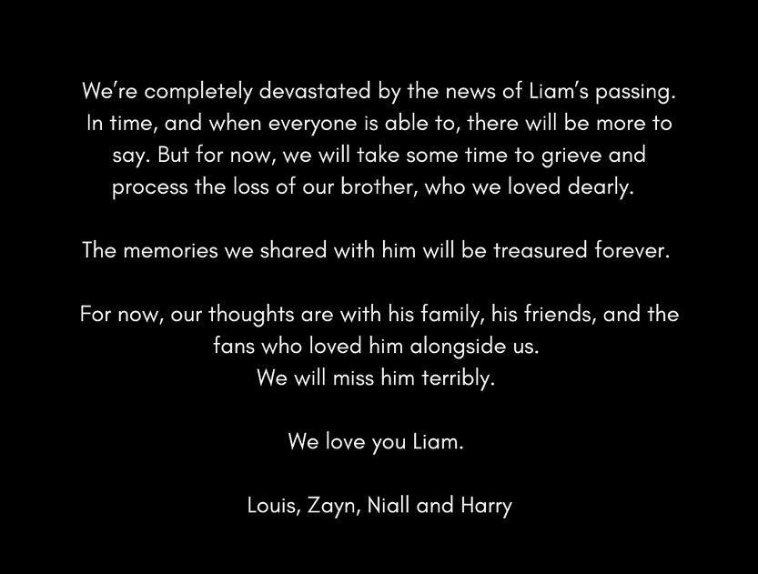 „Potpuno smo skrhani vestima o Liamovoj smrti. Vremenom, i kada svi budu u mogućnosti, biće još toga što ćemo reći. Ali za sada će nam trebati neko vreme da tugujemo i procesuiramo gubitak našeg brata, kojeg smo jako voleli. Uspomene koje smo podelili sa njim biće zauvek sačuvane. Za sada, naše misli su sa njegovom porodicom, njegovim prijateljima i fanovima koji su ga voleli pored nas. Užasno će nam nedostajati. Volimo te Liam“, dok u potpisu stoji: Zejn, Hari, Luis i Najal.