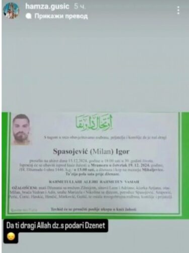 Kako prenose domaći mediji, Hamza i članovi njegove porodice opraštaju se od bliskog rođaka koji je izgubio dugotrajnu i tešku borbu sa opakom bolešću u svojoj 39. godini života.