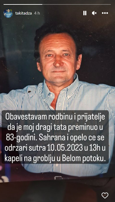 – Obaveštavam rodbinu i prijatelje da je moj dragi tata preminuo u 83. godini. Sahrana i opelo će se održati sutra 10.05.2023. u 13h u kapeli na groblju u Belom potoku. – Napisao je Taki u svojoj objavi.
