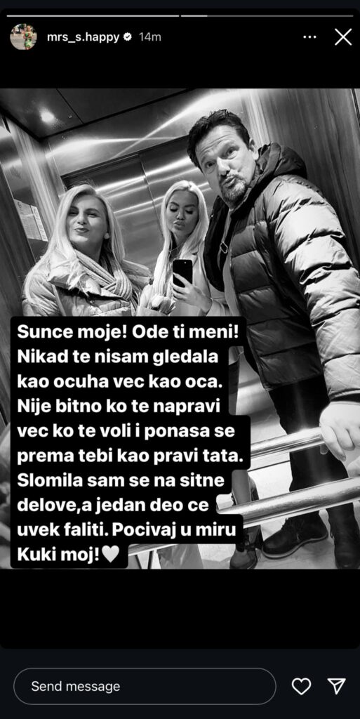 – Sunce moje! Ode ti meni! Nikad te nisam gledala kao očuha već kao oca. Nije bitno ko te napravi već ko te voli i ponaša se prema tebi kao pravi tata. Slomila sam se na sitne delove, a jedan deo će uvek faliti. Počivaj u miru Kuki moj – napisala je Sanja. Uz sliku iz srećnih dana, sa očuhom i majkom. Kada su svi troje bili srećni i nasmejani.