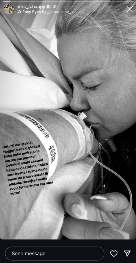 – Četvrti dan pakla. Najgori osećaj gledati kako neko umire, a ne možeš mu pomoći. Čekajući svaki sekund kada će da izdahne. Toliko sam besna i tužna da ne znam da li bih vrištala ili plakala. Čuvajte i volite svoje, jer ne znate šta nosi sutra – poručila je Stankovićeva.