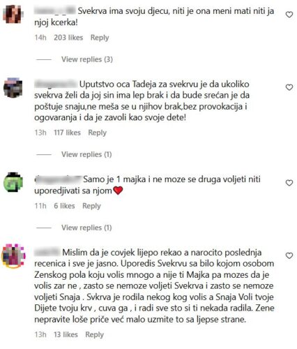„Ako je svekrva normalna to će se prirodno desiti. Ali ako je neka splektarusa koja zabada nosuru tamo gde joj mesto nije, onda brale mozes tu priču da pričaš nede drugde“, napisala je jedna dama.