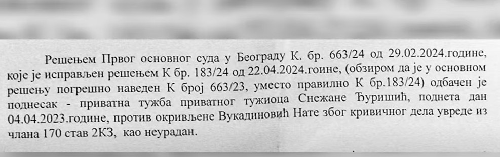 „Ona je meni rekla da pođem u drugu prostoriju. Čučnula je ispred mene i tražila pare od mene da bi moje dete, to jest Dušan nastavio takmičenje. To je sveta istina. Htela sam da obavestim javnost da se zna da je sud prepoznao moju istinu i tužbu odbacio“, rekla je, a u nastavku vam donosimo i sudski dokument koji nam je Nata priložila.