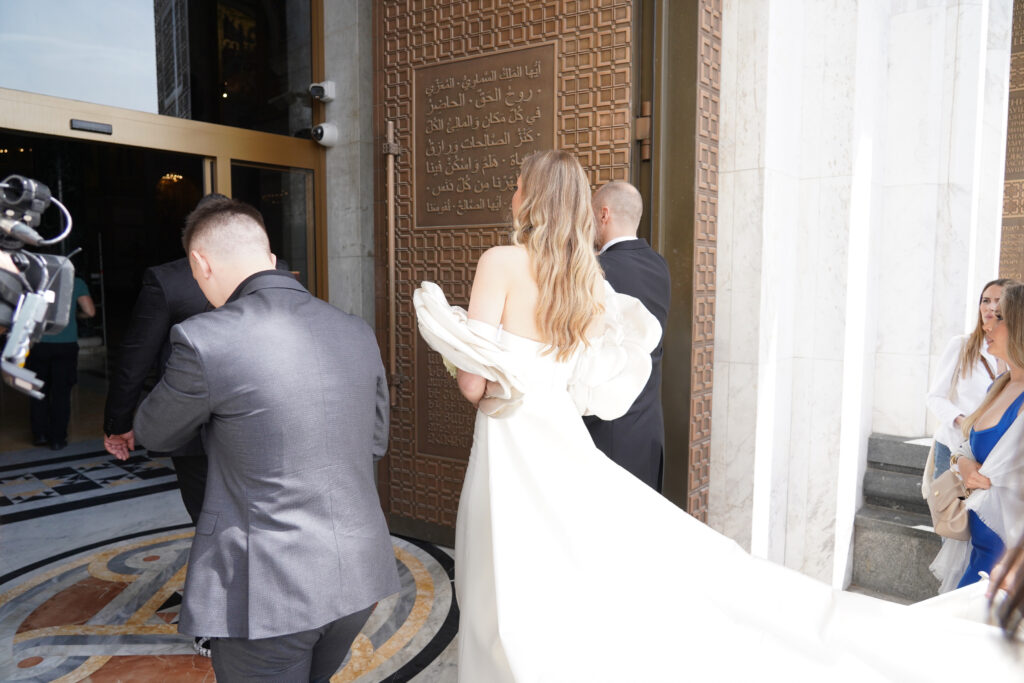 Ljubavni par je stigao ispred crkve, a mlada je blistala u beloj venčanici koja je odisala glamurom. Bela svedena haljina nosi magičnu simboliku, te je na šlepu pisalo na italijanskom jeziku „te amo“, što u prevodu znači „Volim te“. Venčanica ima duboki šlic, a rukavi su oduševili sve.