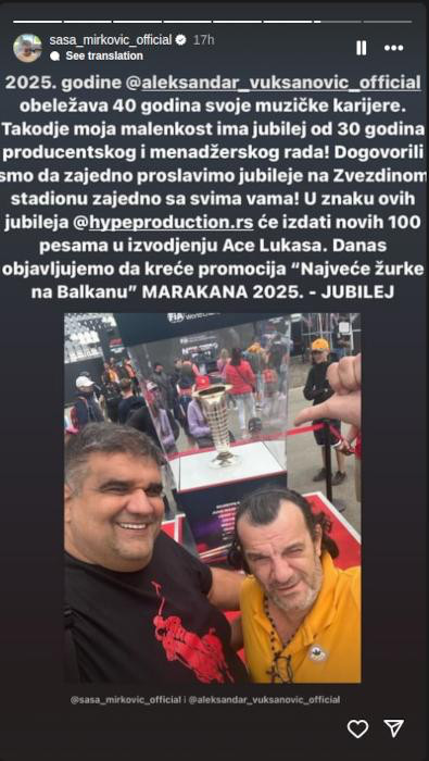 – Dogovorili smo da zajedno proslavimo jubileje na Zvezdinom stadionu zajedno sa svima vama! U znaku ovih jubileja Hajp produkcija će izdati novih 100 pesama u izvođenju Ace Lukasa. Danas objavijujemo da kreće promocija „Najveće žurke na Balkanu“ Marakana 2025. – jubilej – napisao je Saša Mirković.