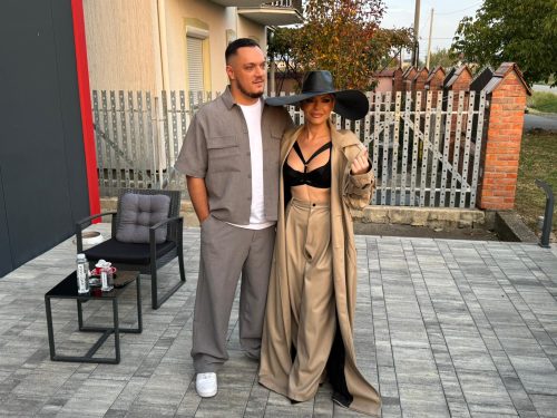 Nenad je za ovu priliku poneo ležerni sivi komplet, košulju kratkih rukava i pantalone, u kombinaciji sa belim patikama, dok je Vanja nosila široke bež pantalone i kaput, uz crni top koji je istakao njen dekolte i šešir.