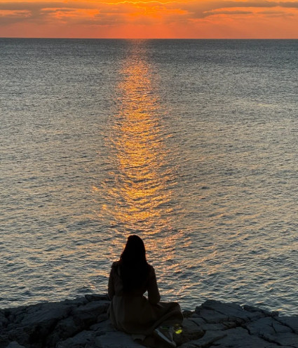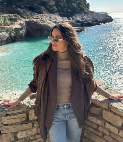 Voditeljka je uživala u zalasku sunca, na sebi je imala uske farmerke, rolku i kaput preko kog je stavila šal. Na lice je stavila naočare za sunce, a pogled na more bio je nestvaran.