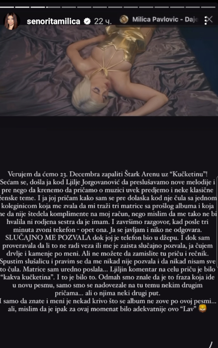 – Verujem da ćemo 23. decembra zapaliti Štark Arenu uz “Kučketinu“! Sećam se, došla ja kod Ljilje Jorgovanović da preslušavamo nove melodije i pre nego da krenemo da pričamo o muzici, uvek pređemo i neke klasične ženske teme. I ja joj pričam kako sam se pre dolaska kod nje čula sa jednom koleginicom koja me zvala da mi traži tri matrice sa prošlog albuma i koja ne da nije štedela komplimente na moj račun, nego mislim da me tako ne bi hvalila ni rođena sestra da je imam. I završimo razgovor, kad posle tri minuta zvoni telefon – opet ona. Ja se javljam i niko ne odgovara. Slučajno me je pozvala dok joj je telefon bio u džepu. I dok sam proveravala da li to ne radi veza ili me je zaista slučajno pozvala, ja čujem drvlje i kamenje po meni. Ali ne možete da zamislite tu priču i rečnik. Spustim slušalicu i pravim se da me nikad nije pozvala i da nikad nisam sve to čula. Matrice sam uredno poslala… – započela je Milica na svom storiju.