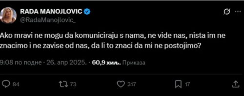 – Ako mravi ne mogu da komuniciraju sa nama, ne vide nas, ništa im ne značimo i ne zavise od nas, da li to znači da mi ne postojimo – glasilo je pitanje pevačice, a odgovoril su brzo ispod posta počeli da se nižu:
