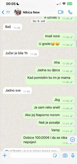 – Ja sam rekao Aneli ako joj je naporno sa Norom neka je pošalje ovamo (prim.aut. u Austriji). Dobiće 100.000 evra i da se nikada ne pojavi- napisao je Asmin u poruci koju je poslao Sitinom mužu.