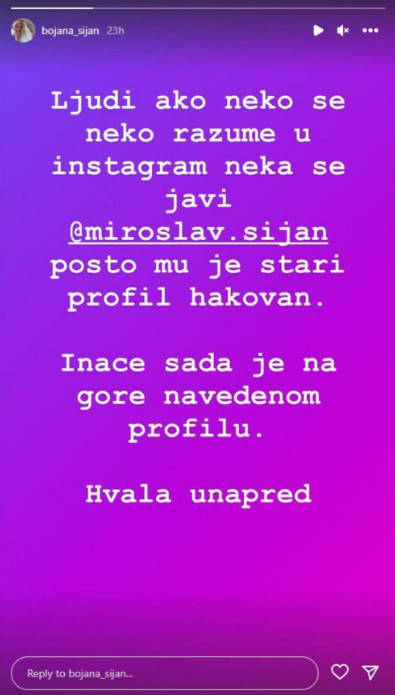 „Ljudi, ako se neko razume u Instagram neka se javi Miroslavu Šijanu, pošto mu je stari profil hakovan. Hvala unapred“, napisala je Bojana.