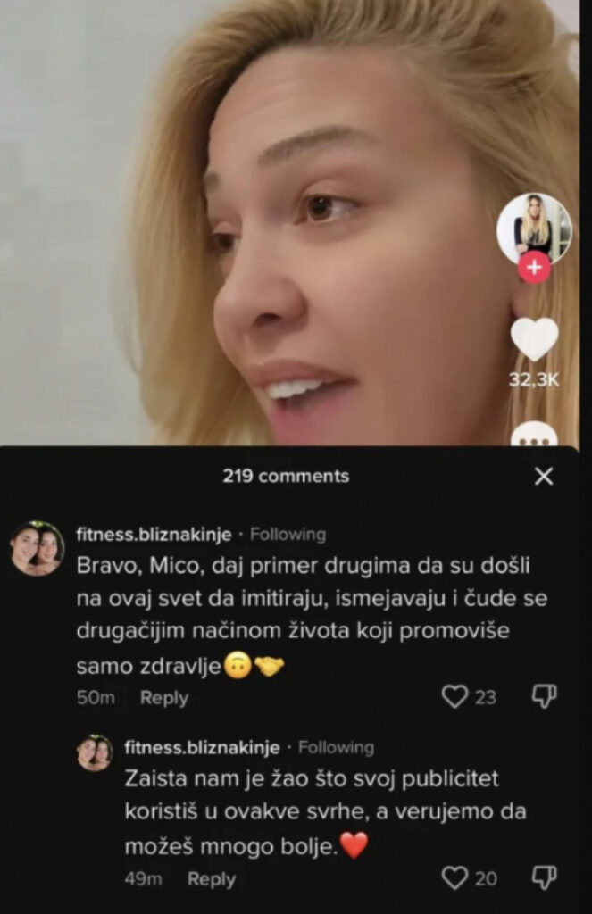 Bravo, Mico, daj primer drugima da su došli na ovaj svet da imitiraju, ismevaju i čude se drugačijim načinom života koji promoviše samo zdravlje. Žao nam je što svoj publicitet koristiš u ovakve svrhe, a verujemo da možeš mnogo bolje – napisale su bliznakinje.