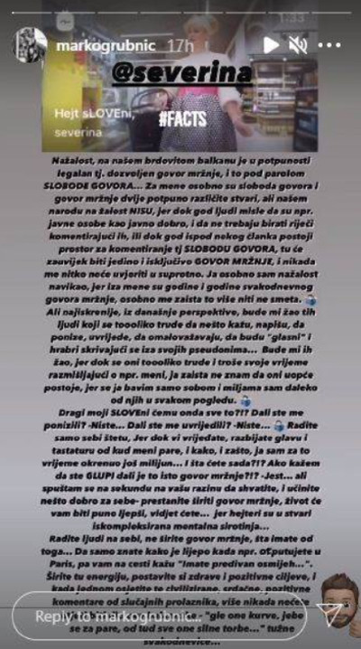 – Radite, ljudi, na sebi, ne širite govor mržnje, šta imate od toga… Da samo znate kako je lepo kad npr. otputujete u Pariz, pa vam na ulici kažu: ‘Imate prekrasan osmeh’… Širite tu energiju, postavite sebi zdrave i pozitivne ciljeve, i kad jednom osetite te civilizovane, srdačne, pozitivne komentare od slučajnih prolaznika, više nikada nećete hteti da budete deo ove balkanske – ‘gle one ku*ve, je*e se za pare, odatle sve one silne torbe..’, tužne svakodnevice, poručio je pratiocima putem Instagrama.