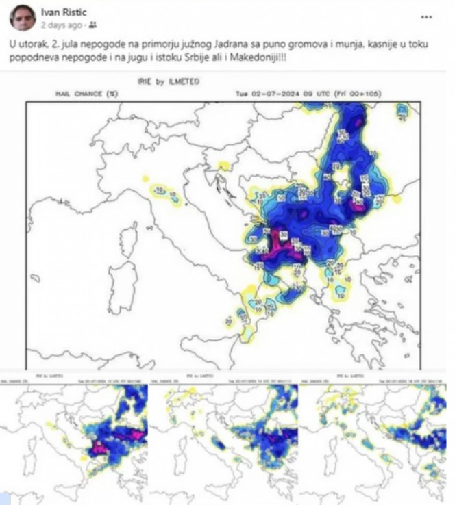– Samo hladni front na kome se mogu razviti lokalno nepogode. Oblaci, pojačan severozapadni vetar, kiša i grmljavine stižu u Srbiju u ponedeljak uveče oko 20 časova – ističe Ristić na svom Fejsbuku.