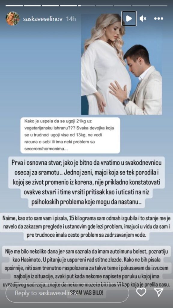 – Naime, kao što sam vam i pisala, 15 kilograma sam odmah izgubila i to stanje me je navelo da zakažem preglede i ustanovim gde leži problem, imajući u vidu da sam i pre trudnoće imala često problem sa zadržavanjem vode. Nije me bilo nekoliko dana jer sam saznala da imam autoimunu bolest, poznatiju kao Hašimoto. Kako ne bih pisala opširnije, niti sam trenutno raspoložena za takve teme i pokušavam da izvučem najbolje iz situacije, svaki put kada nekome napišete poruku u kojoj ima uvredljivog sadržaja, znajte da nekome možete biti baš VI kap koja je prelila čašu. SRAM VAS BILO – bila je oštra Saška.