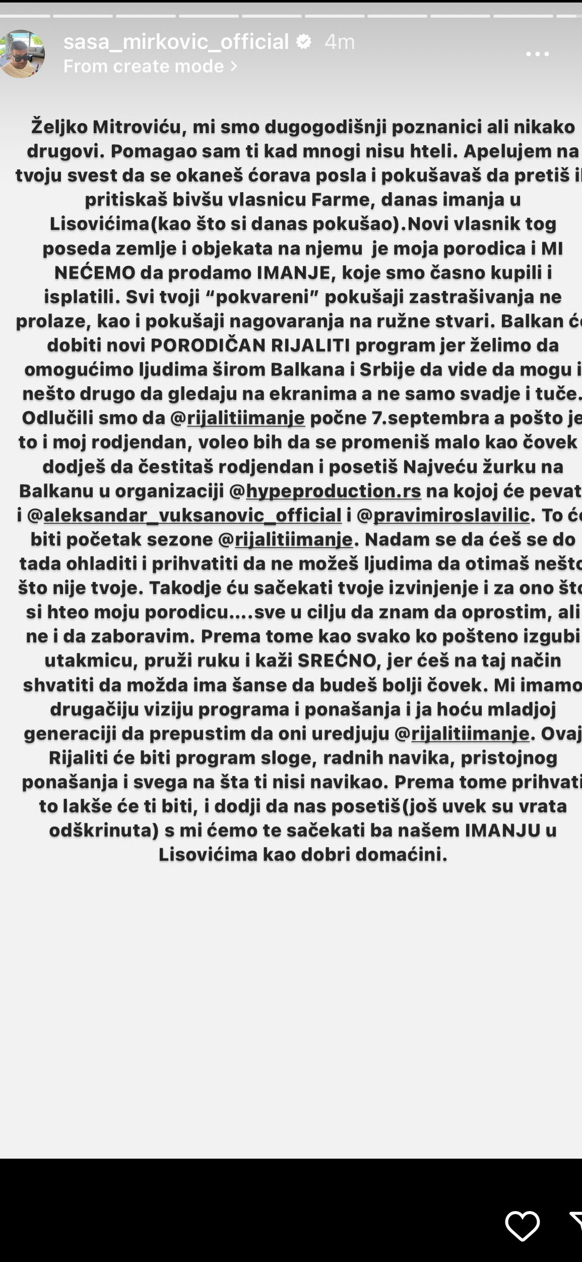 “Prema tome kao svako ko pošteno izgubi utakmicu, pruži ruku i kazi SREĆNO. Jer ćeš na taj nacin shvatiti da možda ima šanse da budeš bolji covek. Mi imamo drugačiju viziju programa i ponasanja i ja hocu mladjoj generaciji da prepustim da oni uredjuju rijaliti “IMANJE”. Ovaj rijaliti će biti program sloge, radnih navika, pristojnog ponasanja i svega na sta ti nisi navikao. Prema tome prihvati to lakse će ti biti, i dodji da nas posetis (jos uvek su vrata odškrinuta) a mi cemo te sacekati na nasem IMANJU u Lisovićima kao dobri domaćini.”, napisao je Saša Mirković.