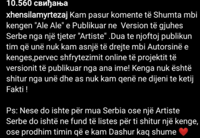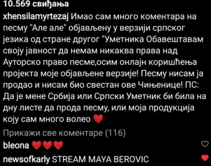 – Imala sam mnogo komentara na pesmu „Ale, ale“, koju je u srpskoj verziji objavio drugi „umetnik“ (pevač, prim. aut.). Obaveštavam javnost i svoje pratioce da nemam nikakva autorska prava nad ovom pesmom, osim onlajn korišćenja projekta moje objavljene verzije! Pesmu nisam ja prodala i nisam bila svesna ove činjenice! P. S. Da se ja ili moja produkcija pitamo, Srbija ili srpski umetnik bi bio na dnu liste da im se proda pesma – završila je svoj komentar Džensila, koja je objavila i skrinšot iz Majinog spota, zbog čega je dobila mnoštvo pozitivnih komentara svojih pratilaca.