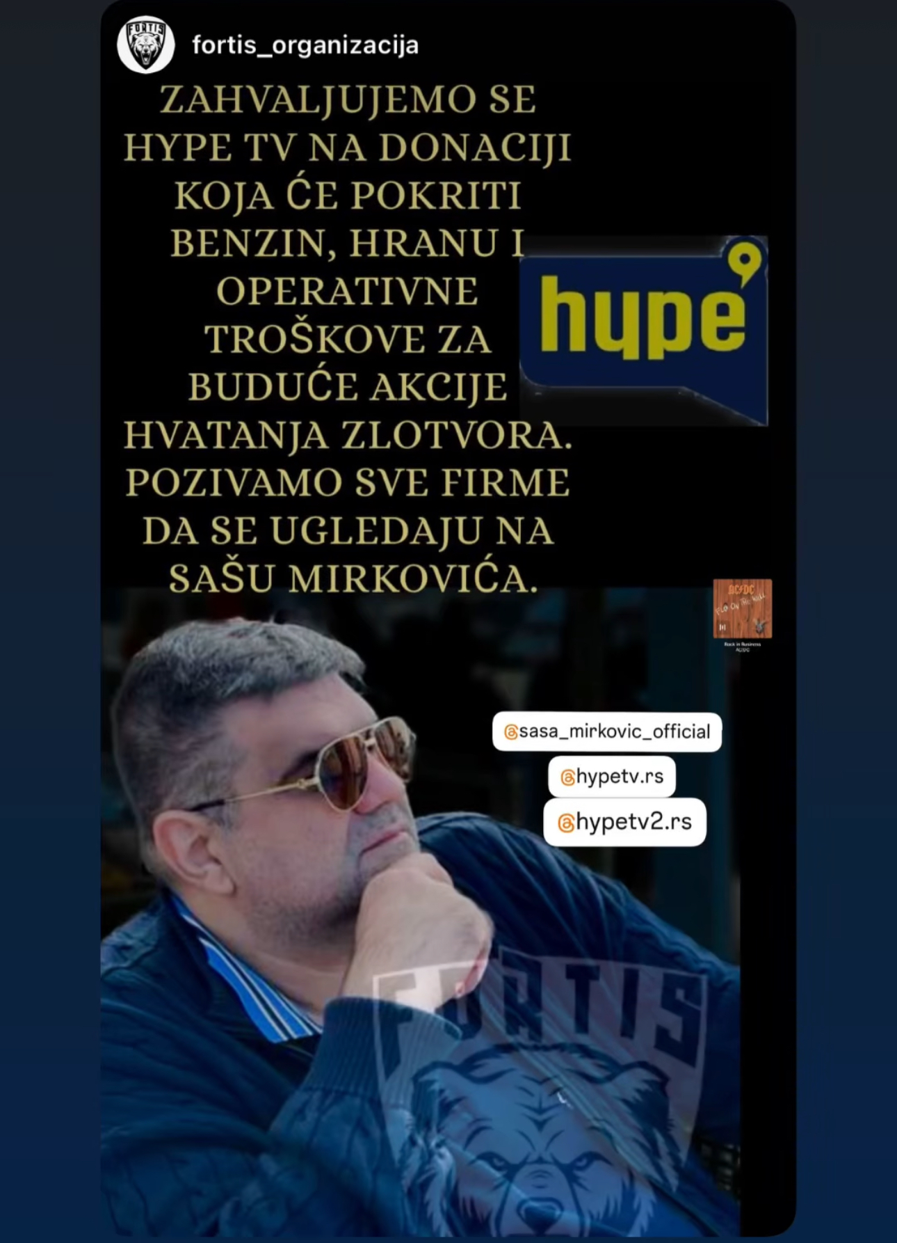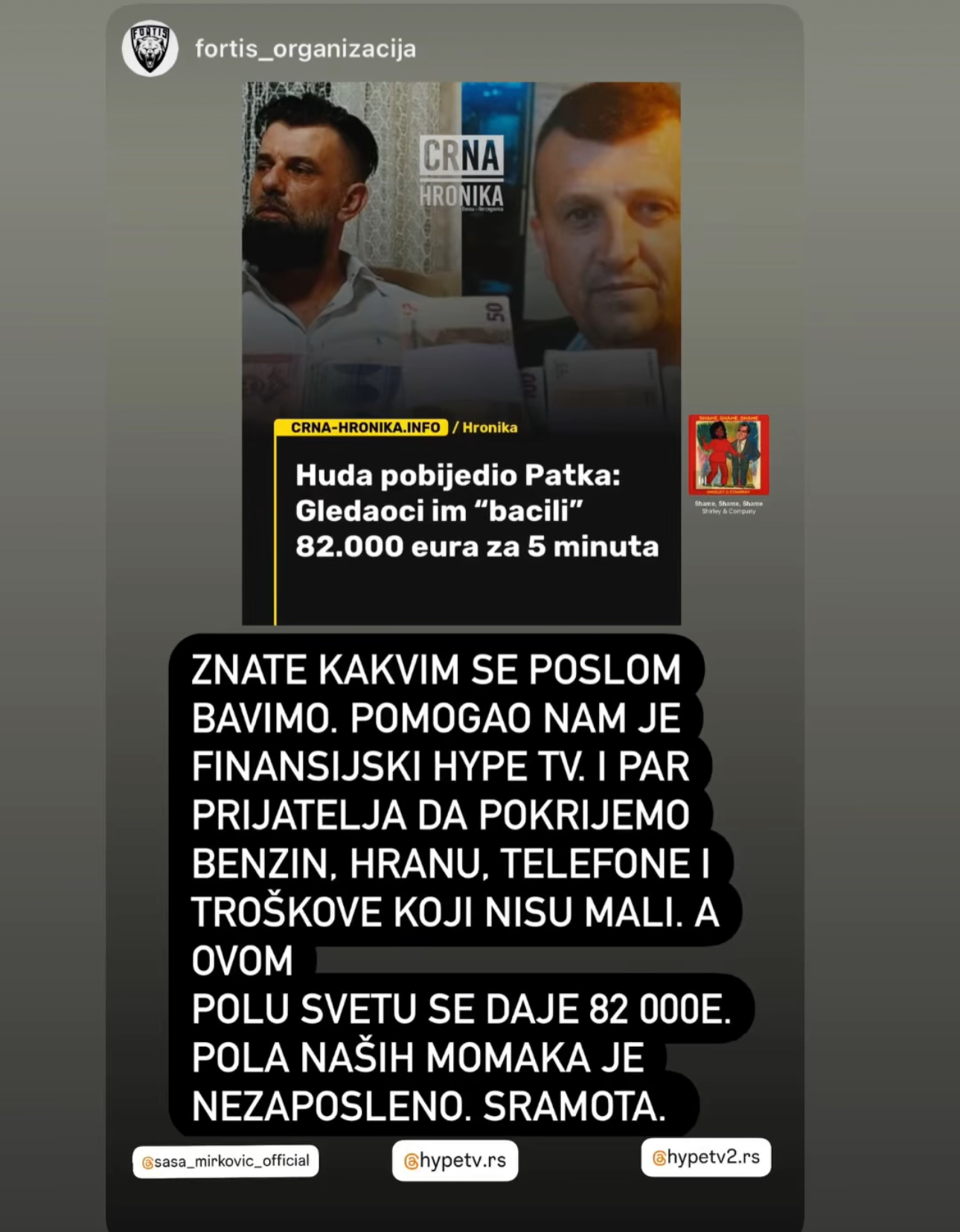 ”Znate kakvim se poslom bavimo.Pomogao nam je finansijski HYPE TV i par prijatelja da pokrijemo bezin, hranu, telefone i troškove koji nisu mali. A ovom polusvetu se daje 82.000€. Pola naših momaka je nezaposleno! Sramota!”, glasila je objava koju je repostovao i direktor i vlasnik Hype televizije, Saša Mirković.