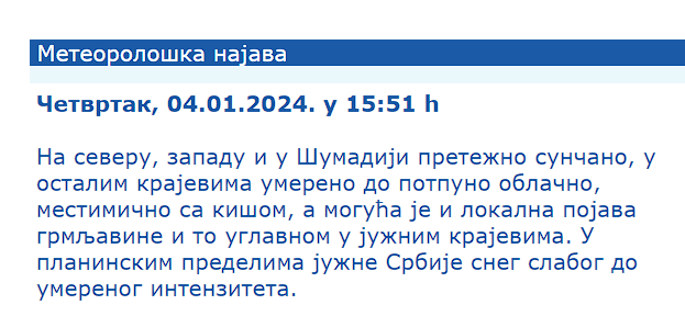 U planinskim predelima južne Srbije sneg slabog do umerenog intenziteta, stoji u najavi RHMZ od 15:51h.