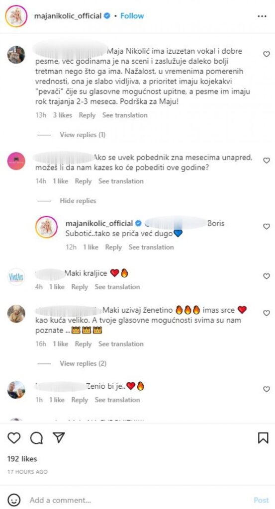 Na pitanje u komentarima zna li ko će pobediti, Maja je ko iz topa odgovorila da će to biti Boris Subotić.