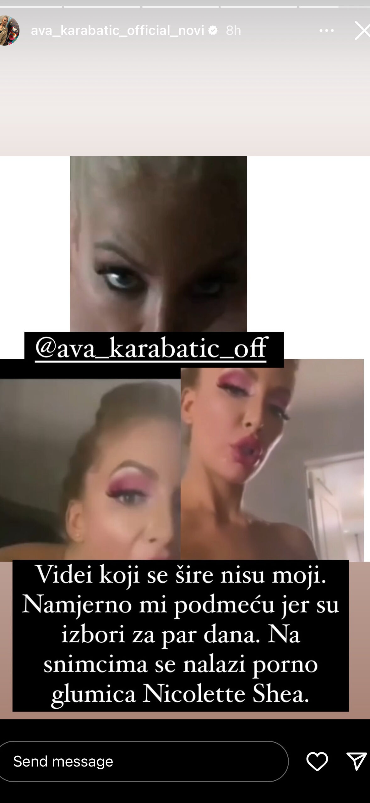 “Videi koji se šire nisu moji.Namerno mi podmeću jer su izbori za par dana. Na snimcima se nalazi p*rno glumica Nikoleta Shea”., napisala je Ava.
