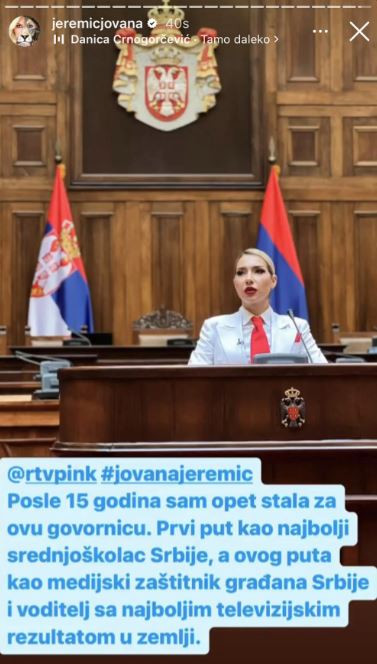 „Posle 15 godina sam opet stala za ovu govornicu. Prvi put kao najbolji srednjoškolac Srbije, a ovog puta kao medijski zaštitnik građana Srbije i voditelj sa najboljim televizijskim rezultatom u zemlji“, napisala je Jovana i podelila fotografije iz Skupštine“, napisala je voditeljka u objavi.
