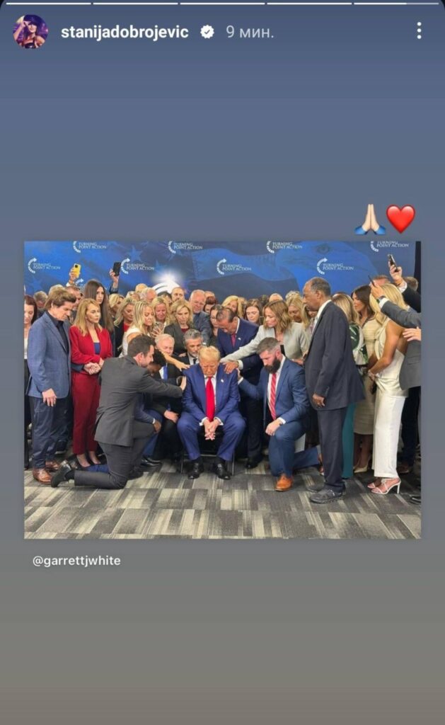 Ona je na svom Instagram profilu objavila fotografiju Donalda Trampa kako sedi dok su članovi njegovog kabineta okupljeni oko njega, te ga svi dodiruju. Pored fotografije je stavila srce i ruke kako se mole, čime je pokazala da je i njen glas bio za Donalda Trampa, te da joj je drago što je pobedio.