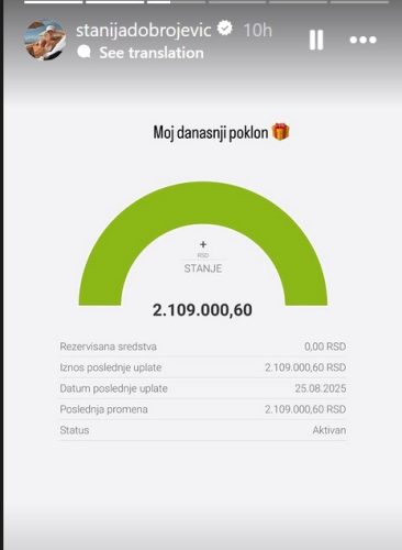 Međutim, njen noćašnji post pokazuje da je na njen račun legla milionska uplata. Tačnije 2. 109.000 dinara. Što bi iznosilo oko 20.000 eura. Dok je iznad prikaza cifre dodala: „Moj današnji poklon“. I dok mnogi nagađaju o čemu je reč, kao i da li je uplata od bivšeg, u narednom postu Stanija do njekle obelodanila o čemu je reč.