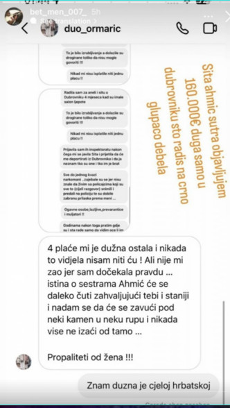 – Sita Ahmić, sutra objavljujem 160.000 eura duga samo u dubrovniku što radiš na crno, glupačo debela – napisao je Asmin na sledećem storiju koji je objaviona društvenoj mreži Instagram.