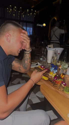 Naime, njegova lepša polovina je na svom Instagram profilu objavila kako ga je iznenadila u ponoć u jednom prestoničkom lokalu sa daskom na kojoj je pisalo: “Srećan rođendan“, a na kojoj je bilo puno voća i kolača, kao i svećica u broj 33.