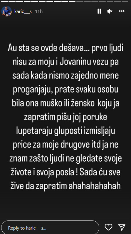 – Au šta se ovde dešava… Prvo ljudi nisu za moju i Jovaninu vezu, pa sada kad nismo zajedno mene proganjaju, prate svaku osobu bila ona muško ili žensko koju ja zapratim, pišu joj poruke, lupetaraju gluposti, izmišljaju gluposti za moje drugove itd..