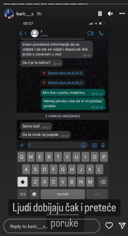 Ja ne znam zašto ljudi ne gledate svoje živote i posla! Sada ću sve žive da zapratim – napisao je Karić, a onda u narednim storijima podelio prepiske koje njegovi prijatelji dobijaju, a u kojima im se preti da će ih “pojesti mrak“.