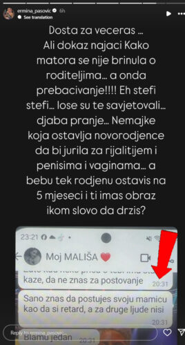 „Dosta za večeras. Ovo je najjači dokaz kako se Matora ‘nije brinula o roditeljima’. Eh Stefi, Stefi, loše su te savetovali, džaba pranje“, napisala je Ermina osudivši je što je iostavila tek rođenu bebu i ušla u rijaliti.